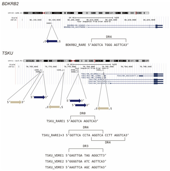 Presumed vitamin-responsive genomic sequences of BDKRB2 and TSKU. The known consensus sequences of RARE or VDRE were searched in a promoter area of about 20 kb, and the position of the hit sequence was mapped using the UCSC genome browser.