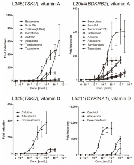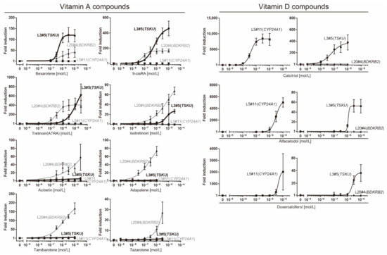 Dose–response analysis of reporter cells (Table 1) against various vitamin analogs using a luciferase assay. The plots are the mean from three independent experiments with three measurements each. Error bars indicate SD. The fold-induction value for 0 M was defined as 1.