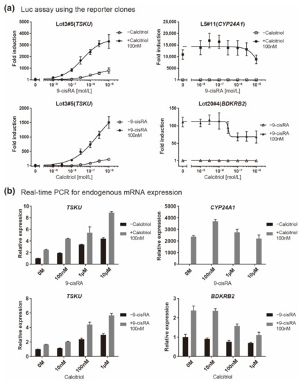 Responsiveness in the case of co-existence of vitamin A (9-cisRA) and vitamin D (calcitriol). A quantitative analysis was performed using two assays when the concentration of 9-cisRA was increased in the absence or in the presence of calcitriol and vice versa. (a) Luciferase assay of the indicated reporter cell clone in which the gene indicated in parentheses responded and (b) real-time PCR analysis of the endogenous expression of the indicated mRNA. The plots are the mean from three independent experiments with three measurements each. Error bars indicate SD.