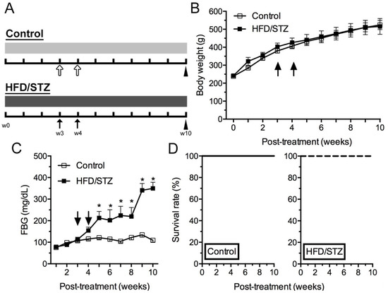 Experimental design and assessments of body weight and fasting blood glucose (FBG). (A) Rats were assigned to the control (upper panel) and high-fat diet (HFD)/streptozotocin (STZ) groups (lower panel). Light gray bar indicates rats fed a standard chow diet and dark gray bar indicates those fed an HFD. Either citrate buffer (hollow arrow in upper panel) or STZ (solid arrow in lower panel) were administered at week 3 (w3) and week 4 (w4) after the beginning of feeding protocol (w0). Arrowhead indicates end of experiments (w10). (B,C) Graphs indicating the changes in body weight (B) and FBG (C) between control (opened square) and HFD/STZ (filled square) groups. Arrows: STZ injections. * p < 0.05: compared with control group. (D) Comparison of survival curves between control (left panel) and HFD/STZ groups (right panel). No experimental animals died in this study.