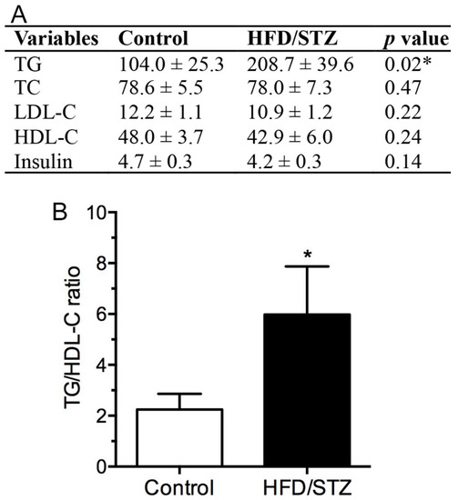 We also examined serum lipid profiles (Figure 2), and the results revealed that the triglyceride (TG) level was significantly increased in the HFD/STZ group compared with the control group (p = 0.02), indicating hypertriglyceridemia after HFD/STZ administration. However, the total cholesterol (TC), low-density lipoprotein cholesterol (LDL-C), high-density lipoprotein cholesterol (HDL-C), and insulin levels in the HFD/STZ group were similar to those in the control group (Figure 2A). Because vascular risk factors have been identified as potential risk factors for neuropathy in individuals with diabetes [25], we also examined the TC:HDL-C ratio, a more critical risk factor than total or lipoprotein cholesterol for cardiovascular disease [26]. We observed that the TC:HDL-C ratio was increased in the HFD/STZ group compared with the control group (Figure 2B). Specifically, the TC:HDL-C ratio exceeded 5:1 in four out of nine rats (44.4%) in the HFD/STZ group.