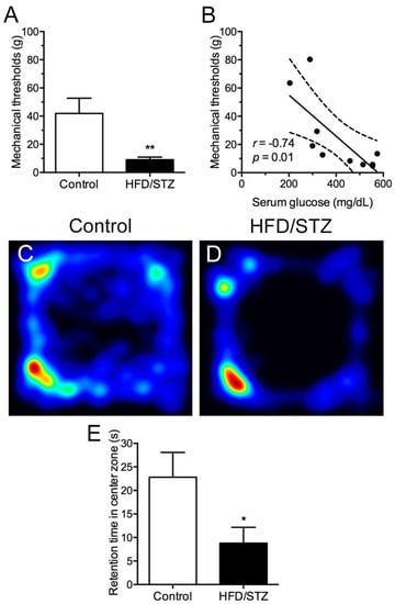 Neurobehavioral changes in the HFD/STZ group. Neurobehavioral assessment conducted using the von Frey monofilament test for mechanical response and an open-field test involving free navigation, as described in the Materials and Methods section. (A) The mechanical threshold of the HFD/STZ group was significantly reduced, and (B) the mechanical thresholds were inversely correlated with serum glucose levels. ** p < 0.01. (C,D) Graphs illustrating the navigation heating trace in an open field for the (C) control and (D) HFD/STZ groups. (E) Bar graph indicating differences in navigation time in the central area of the open field. * p < 0.05. HFD, high-fat diet; STZ, streptozotocin.