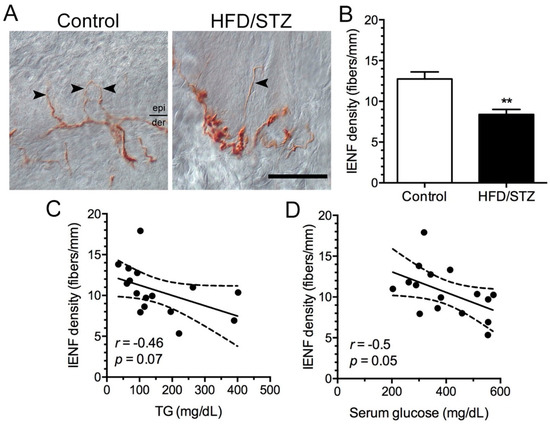Changes in intraepidermal nerve fibers (IENFs) in the HFD/STZ group. (A) IENFs of the skin were observed using protein gene product 9.5 (PGP9.5)-immunostaining in the control (left panel) and HDF/STZ (right panel) groups. PGP9.5(+) IENFs (arrowhead) were decreased in the HFD/STZ group. Bar, 50 μm. (B) Bar graph illustrating the quantitated PGP9.5(+) IENFs. ** p < 0.01. (C,D) Graphs indicating the linear correlations of PGP9.5(+) IENFs with (C) TG and (D) serum glucose. HFD, high-fat diet; STZ, streptozotocin; TG, triglyceride.