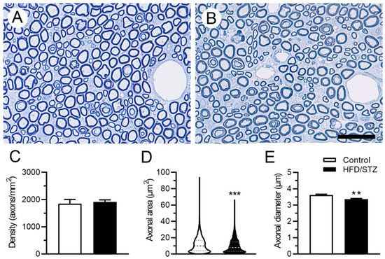 Morphometrics of sural nerves in the HFD/STZ group. (A,B) Photographs depicting semithin sections of Epon-embedded sural nerves in the control (A) and HFD/STZ groups (B). HFD, high-fat diet; STZ, streptozotocin; Bar, 25 μm. (C,D) Morphometric analysis results for sural nerves, revealing changes in axonal density (C) and axonal area (D). The dashed line represents the median percentile, and the dotted line represents the 25th and 75th percentiles. *** p < 0.001. (E) Graph illustrating differences in mean axonal diameter of sural nerves. ** p < 0.01.