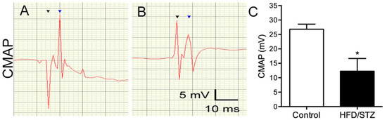 Reduced amplitudes of motor nerve action potential in the HFD/STZ group. (A,B) Graphs illustrating the waveforms of the compound muscle action potential (CMAP) at week 10 for the control (A) and HFD/STZ (B) groups. HFD, high-fat diet; STZ, streptozotocin; black arrowhead, stimulation; blue arrowhead, response. (C) Graph showing the difference in CMAP amplitudes between the two groups. * p < 0.05.