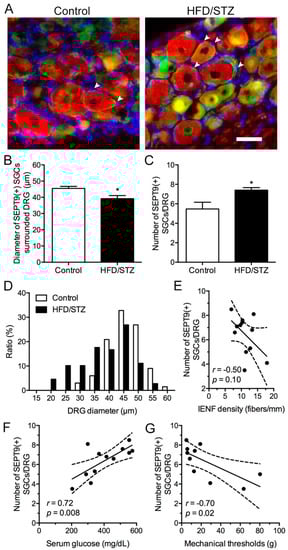 Notably, this study demonstrated a novel SEPT9 expression pattern in the DRG of the rats in the HFD/STZ group (Figure 7). We observed that SEPT9(+) cells, especially SGCs, increased in the HFD/STZ group (Figure 7A). Our quantitative results indicated that the number of SEPT9(+) SGCs per DRG were increased in the HFD/STZ group compared with those in the control group (7.4 ± 0.6 vs. 5.5 ± 1.7 SGCs/DRG, p = 0.03; Figure 7B). In particular, DRG neurons preferentially enclosed by the SEPT9(+) SGCs were observed to have a smaller diameter in the HFD/STZ group than in the control group (39.2 ± 4.6 vs. 45.5 ± 3.0 μm, p = 0.02; Figure 7C). For example, the histogram spectrum of DRG neuronal sizes with SEPT9(+) SGCs exhibited a left shift (Figure 7D). Although the numbers of SEPT9(+) SGCs/DRG were not correlated with IENFs (Figure 7E), they exhibited a linear correlation with the serum glucose levels (r = 0.72, p = 0.008; Figure 7F) and mechanical thresholds (r = −0.70, p = 0.02; Figure 7G).