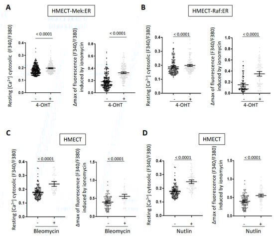 Regulation of intracellular Ca2+ levels has been recently reported in some contexts of cellular senescence, and we and others have demonstrated that Ca2+ transfer from endoplasmic reticulum to mitochondria promotes cellular senescence [,,,]. To know whether Ca2+ level alterations are a classical mark of senescent cells, we measured Ca2+ levels in HMEC in proliferation versus senescence using different types of senescence inducers: oncogenes, the chemotherapeutic agent bleomycin, or the p53 stabilizer nutlin-3. For oncogene-induced senescence (OIS), telomerase-expressing HMEC (HMECT) were infected with retroviral vectors encoding Mek or Raf oncogenes in fusion with the ligand binding domain of estrogen receptor (ER) (HMECT-Mek:ER; HMECT-Raf:ER), inducible with 4-HydroxyTamoxifen (4-OHT). These HMECT expressing inducible oncogenes enter OIS upon oncogene activation by adding 4-OHT [,,,]. Senescence was otherwise induced by the genotoxic drug bleomycin through activation of a DNA damage response or by nutlin through stabilization of p53, one of the main effectors of senescence (data not shown). Using the cytosolic Ca2+ probe Fura2, we assessed Ca2+ contents both in the cytosol and in the intracellular stores (i.e., mainly Ca2+ stored in endoplasmic reticulum and mitochondria). The size of intracellular Ca2+ stores was appreciated as the Ca2+ increase in the cytosolic Ca2+ compartment due to the ionomycin-induced membrane permeabilization and the subsequent organelles’ depletion obtained in the absence of external Ca2+. All the senescence inducers provoked an increase in the resting cytosolic Ca2+ concentration and in the intra-organelle Ca2+ content (Figure 1). Therefore, this global Ca2+ increase appears to be a mark of cellular senescence in HMECT.