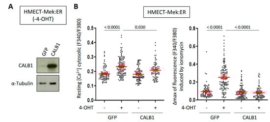 CALB1 overexpression buffers increased Ca2+ levels induced by oncogene activation in HMECT. (A) CALB1 protein level was assessed by Western Blot in HMECT-Mek:ER (without 4-OHT) infected with a vector encoding CALB1 or the corresponding GFP control vector. α-Tubulin protein level was assessed as a loading control. (B) Ca2+ levels were measured with the ratiometric probe Fura2 in HMECT-Mek:ER inducible oncogene and CALB1 or the corresponding GFP control vector, with or without 4-OHT treatment. Resting cytosolic Ca2+ concentration was evaluated as a stable fluorescent ratio before stimulation (left panel), and the size of Ca2+ intracellular stocks was estimated as the Ca2+ peak amplitude obtained after ionomycin stimulation (right panel). Means +/− SEM of 3 independent experiments are presented. Kruskal–Wallis test was performed, and p-values are indicated. Three days after 4-OHT treatment, GFP- 4-OHT n = 85 or + 4-OHT n = 126, CALB1- 4-OHT n = 99 or + 4-OHT n = 77.