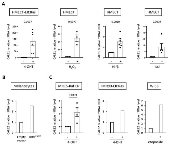Finally, as an increase in intracellular Ca2+ contents appears to be a common mark of senescence based on our data in epithelial cells (Figure 1) and on data in other cell types according to previous reports [,,], we investigated whether induction of the expression of calcium-buffering calbindin-type proteins could also be a common mark of senescent cells. In addition to Raf and Mek oncogenes, bleomycin, and nutlin (Figure 1), other senescence inducers such as Ras oncogene activation, H2O2, TGFβ, or KCl, which are all known to induce senescence in HMECT [,,,], also triggered a rise in CALB1 expression in HMECT (Figure 5A). We then explored if an induced expression of some calbindins could also be observed upon senescence in other cell types by interrogating published transcriptome data as well as performing RT-qPCR. In melanocytes induced in senescence by B-RafV600E oncogene, no increase in CALB1 expression could be detected (data not shown), but induction of mRNA levels of CALB2 (calbindin 2, also called calbindin-D29K or calretinin), another well-known calcium-buffering protein (Figure 5B) []. CALB2 expression was also increased in normal human fibroblasts upon Raf activation, as well as in response to other senescence-inducing stresses such as Ras activation [] or etoposide treatment [] (Figure 5C). Expression of calbindins is thus induced in senescent cells, but induction of both CALB1 and CALB2 in the same senescence model was not observed, suggesting cell-type specificity in the calbindin induced during senescence.