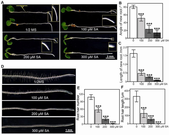 - Bagautdinova, Z.Z.; Omelyanchuk, N.; Tyapkin, A.V.; Kovrizhnykh, V.V.; Lavrekha, V.V.; Zemlyanskaya, E.V. Salicylic Acid in Root Growth and Development. Int. J. Mol. Sci. 2022, 23, 2228. [Google Scholar] [CrossRef] [PubMed]