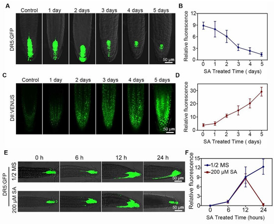 2.2. SA Reduces Auxin Accumulation and Distribution in the Root Apical Meristem