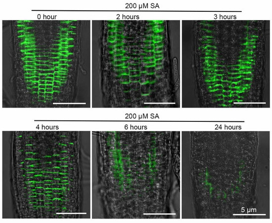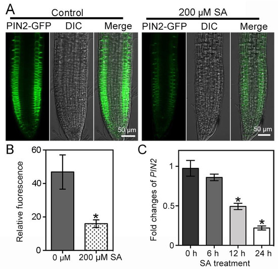 2.3. SA Reduces PIN2 Accumulation and Distribution in the Roots