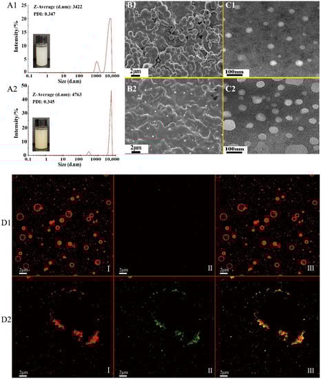 The appearances of PEs (Pickering emulsion stabilized with zein/SA and no Asta loading) and APEs were uniform and stable. Further, a slight red color was observed for APEs due to Asta being entrapped (Figure 1A1,A2). PEs showed a uniform distribution with an average particle size of 3.422 μm, with a polydispersity index (PDI) of 0.347. By comparison, the average particle size of APEs increased to 4.763 μm after Asta loading; whereas its PDI (0.345) value was similar to that of PEs. APEs are soluble in water at any ratio, and the encapsulation efficiency of Asta in APEs was 86.7 ± 3.8% with 0.420 μg/mg of Asta.