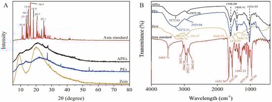 X-ray diffraction (XRD) and Fourier transform infrared spectroscopy (FTIR) spectra of APEs compared with PEs, zein and Asta standard. (A) XRD analysis in the range of 5–90°, and (B) FTIR analysis from 400 to 4000 cm−1.