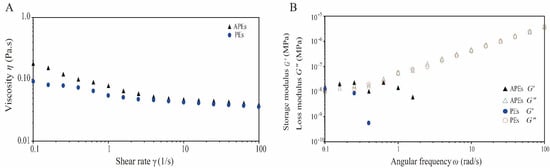 Rheological properties of APEs as compared with PEs at 25 °C. (A) Viscosity (η) as a function of shear rate (γ) increased from 0.1 to 100 s−1, (B) dynamical oscillatory frequency sweep test curves of storage modulus (G′) and loss modulus (G′′) vs. angular frequency (ω) from 0.1 to 100 rad/s.