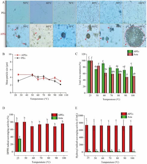 Thermal stability of APEs after 30 min of treatment at 25 °C to 100 °C. PEs or bare Asta was used as comparison. (A) optical micrograph changes of APEs, scale at 400 times magnification, (B) mean particle size of APEs, (C) total Asta retention rate in APEs as compared to bare Asta, (D) DPPH radical-scavenging activity of APEs compared with bare Asta, and (E) hydroxyl radical-scavenging activity of APEs compared with bare Asta. Data were expressed as the mean ± standard deviation (n = 3). Different lower-case letters on the bars in (C–E) indicate significant differences (p < 0.05).