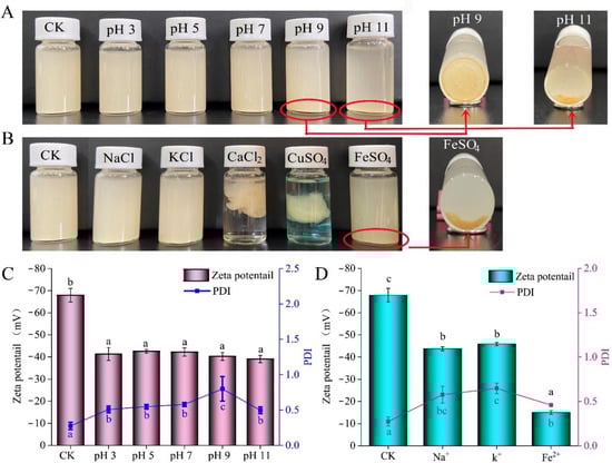 Changes of visual appearance, zeta potential and PDI of APEs after treated at pH 3, 5, 7, 9 and 11 buffers, or 100 mM of Na+, K+, Ca2+, Cu2+, and Fe2+ metal ions at room temperature. (A) Visual appearance after blended with different pH buffers; (B) visual appearance after blended with Na+, K+, Ca2+, Cu2+, and Fe2+, respectively; (C) zeta-potential and PDI changes at different pH values (3–11); and (D) zeta-potential and PDI changes at Na+, K+, and Fe2+ conditions. All data in (C,D) were expressed as the mean ± standard deviation (n = 3). Different lower-case letters on the bars suggested significant differences (p < 0.05).