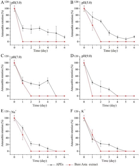 Effects of pH and metal ions on the total Asta retention of APEs during storage for six days under ambient temperature. The bare Asta extract was used as comparison. (A) Under pH 3.0 buffer, (B) under pH 5.0 buffer, (C) under pH 7.0 buffer, (D) under pH 9.0 buffer, (E) treated with 100 mM of Na+, and (F) treated with 100 mM of K+. Data were expressed as the mean ± standard deviation (n = 3).