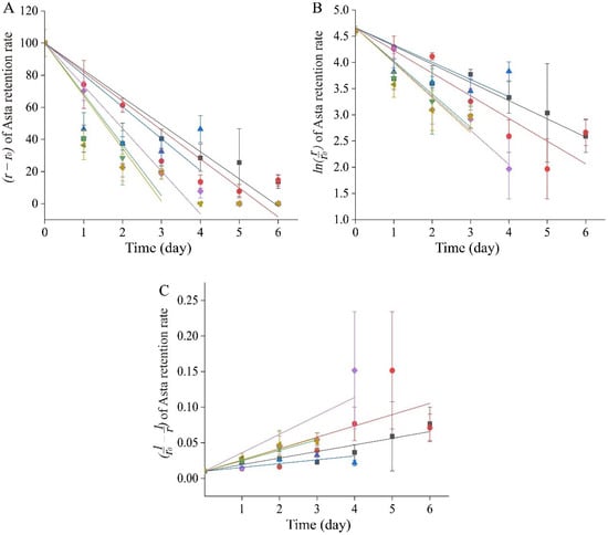 where r0 was the initial Asta retention rate (%); r represented the Asta retention rate at different time t (%); k represented the constant of degradation rate; t represented time (day). A plot of Asta retention rate (r − r0) versus time was constructed. The slope of the straight line (k) and the correlation coefficient (R) were obtained from the trend line of the plot.