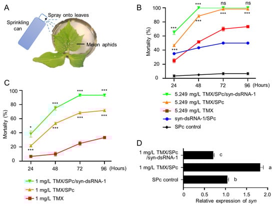 2.4. Co-Delivery of syn-dsRNA and Thiamethoxam Caused Efficient Lethality to Melon Aphids