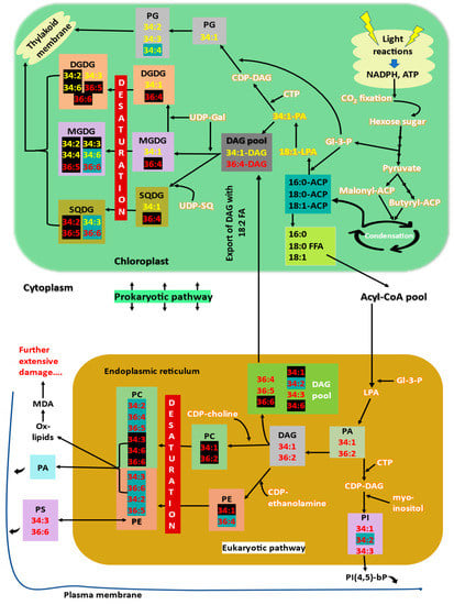 - Extra-plastidial lipids such as PC, PE, PS, and PI are also remodelled. Unsaturated phospholipid contents are decreased (34:2-PC/PE/PI, 36:4-PC/PE, 36:5-PC, 36:6-PC) (lipids highlighted with blue in Figure 1, eukaryotic pathway), while the levels of saturated and monounsaturated fatty acid containing phospholipids are increased (lipids highlighted with black in Figure 1, eukaryotic pathway) [,,]. Under high-temperature extremes, levels of lyso-phospholipids increase sharply, indicating the removal of fatty acid from membrane lipids. Thus, lyso-phospholipid content can be considered a sensitive indicator for plant stress response [].