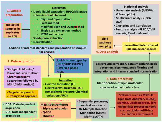 Flowchart of quantitative mass spectrometric analysis of lipid molecular species. Abbreviations: MTBE, Methyl tert-butyl ether; HPLC, High-Pressure Liquid Chromatography; UHPLC, Ultra-High-Pressure Liquid Chromatography; UPLC, Ultra-Pressure Liquid Chromatography; HILIC, Hydrophilic Interaction Chromatography; Q-TOF, quadrupole-Time of Flight; MSALL, All ion fragmentation; SWATH, Sequential Window Acquisition of all Theoretical fragment-ion spectra; ANOVA, Analysis of Variance; PCA, Principal Component Analysis; LDA, Linear Discriminate Analysis; PLS-DA, Partial Least-Square Discriminate Analysis.