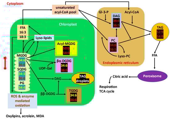 - High-temperature stress induces acylation of the galactose moiety of MGDG, yielding acyl-MGDG such as 52:9/54:9-acyl-MGDG and lyso-MGDG [,]. Increased acyl-MGDG indicates damaged chloroplasts []. Lyso-lipids can be again reacylated to MGDGs or can be hydrolysed to yield fatty acids for TAG synthesis. (Figure 3).
