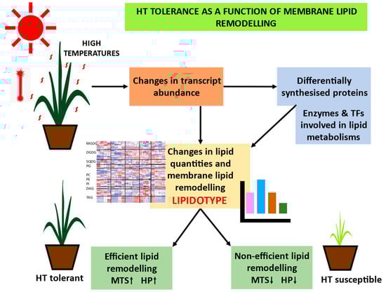 Representation of the hypothesis of considering high-temperature stress tolerance as a function of membrane lipid remodelling. Several lipids and lipid alterations can be considered intermediate phenotype for HT stress tolerance/susceptibility to select tolerant genotypes. Abbreviations: HT—high-temperature; TFs—transcription factors; MTS—membrane thermostability; HP—high-temperature stable photosynthesis.