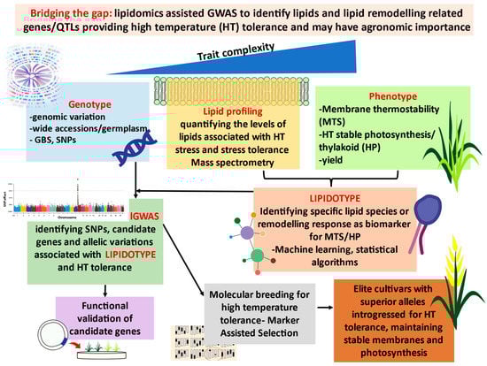 Bridging the gap: Lipidomics-assisted GWAS (lGWAS). Experimental strategy of the proposed lGWAS workflow, providing a novel route for identifying lipids and lipid remodelling-related QTLs/genes providing high-temperature (HT) tolerance and may have agronomic importance. Abbreviations: GBS—Genotyping-by-sequencing; SNP—Single-Nucleotide Polymorphism.