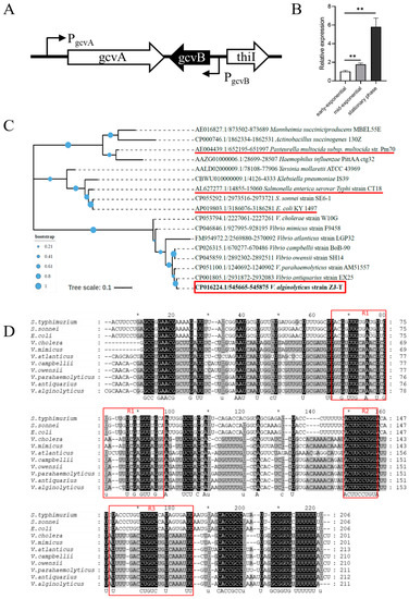 Bioinformatic analysis of gcvB sequence of V. alginolyticus and its expression in LBS. (A) Schematic diagram of small RNA GcvB encoding locations. PgcvA and PgcvB indicate gene gcvA and gcvB promoter, and arrows indicate transcription direction and coding direction; (B) phylogenetic analysis of gcvB among various species using the Maximum likelihood-method with a bootstrap value of 300; (C) conservation analysis of GcvB sequences among various species; (D) relative expression of GcvB in different phase (Student ’s t-test, p value: *, <0.05, **, <0.01). The levels of gcvB were normalized to the internal control 16S rRNA level. Error bars indicate standard deviations.