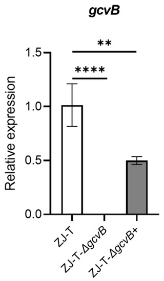 The relative expression of gcvB in wildtype, gcvB mutant and complementary strains (Student ’s t-test, p value: **, <0.01, ****, <0.0001). The levels of gcvB were normalized to the internal control 16S rRNA level. Error bars indicate standard deviations.