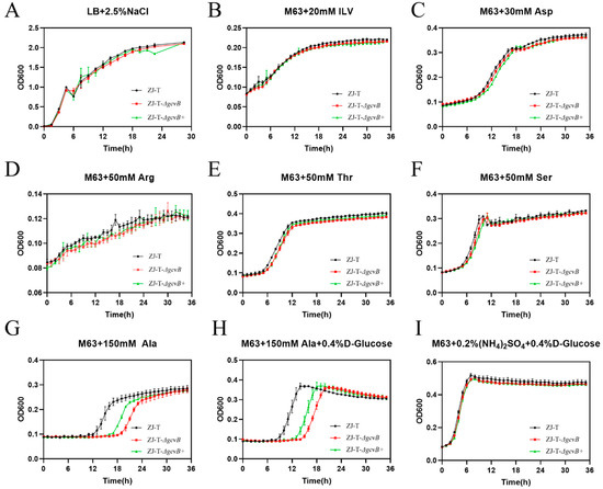 The growth of ZJ-T, ZJ-T-ΔgcvB, and ZJ-T-ΔgcvB+ were measured under several conditions. As shown in Figure 3, there is no significant difference among them when the cells were grown in rich medium LBS (Figure 3A) and minimum media M63 supplemented with NH4+((NH4)2SO4) plus D-glucose, indicating that deletion of gcvB did not affect the uptake and metabolism of carbon and nitrogen sources, nor the amino acid biosynthesis processes from de novo. To investigate the impact of GcvB on the uptake and catabolism of specific amino acids, bacterial growth was measured in M63 supplemented with L-alanine, branched-chain amino acids (L-isoleucine, L-leucine and L-valine), L-aspartic acid, L-arginine, L-threonine, and L-serine. As shown in Figure 3, all of the three strains showed similar growth curves except that when they were grown in M63 plus L-alanine or M63 plus L-alanine plus D-glucose, ZJ-T-ΔgcvB had a much longer lag phase (>8 h) compared to ZJ-T and ZJ-T-ΔgcvB+ partially restored this phenotype. This suggests that gcvB may be involved in alanine uptake and/or catabolism.