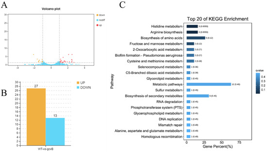 Overview of RNA transcriptomic profiles of wildtype and gcvB mutant strains. (A) Volcanic map of differential genes in transcriptome (FDR < 0.05, |log2(fold change)| ≥ 1). The red dot represents significantly up-regulated difference; the yellow dot represents significantly down-regulated difference; the blue dot represents no difference; (B) Statistical column chart of differential expressed genes. WT: wild-type strain Vibrio alginolyticus ZJ-T; gcvB: gcvB knockout strain ZJ-T-△gcvB; (C) histogram of top 20 of KEGG pathway enrichment in transcriptomics after inactivation of gcvB.