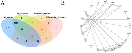 (A) Venn diagram of differentially expressed genes (DEGs) and differentially expressed proteins (DEPs) between wildtype and gcvB knockout strains; (B) PPI network of the identified DEPs (STRING score > 700). These genes showed consistent changes in gene expression with the shape of the lactation curve. The genes located at key nodes were also listed in supplementary Table S4.