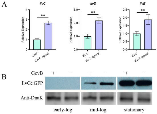 Effects of GcvB on valine/leucine/isoleucine biosynthetic pathway. (A) Relative expression of genes (ilvC, ilvD, ilvE) involved in the valine/leucine/isoleucine biosynthetic pathway by qRT-PCR (Student ’s t-test, p value: **, <0.01). The levels of gcvB were normalized to the internal control 16S rRNA level. Error bars indicate standard deviations; (B) Western blot detection of IlvG translational fusion. For Western blotting, samples were harvested at OD600nm of 0.3~0.4 (early-log), 1.0~1.5 (mid-log), and 3.0~4.0 (stationary) from LBS plus 5 μg/mL Cm (chloramphenicol). Polyclonal anti-Dnak was used as loading control.