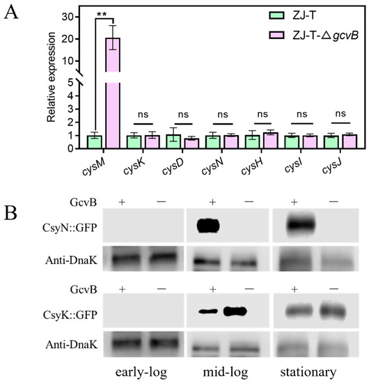 Effects of GcvB on sulfur and cysteine biosynthesis metabolism pathway. (A) Relative expression of genes involved in the sulfur and cysteine biosynthesis metabolism pathway by qRT-PCR (Student ’s t-test, p value: ns, >0.05, **, <0.01). The levels of gcvB were normalized to the internal control 16S rRNA level. Error bars indicate standard deviations; (B) Western blot detection of CysN and CysK translational fusion. For Western blotting, samples were harvested at OD600 of 0.3~0.4 (early-log), 1.0~1.5 (mid-log) and 3.0~4.0 (stationary) from LBS plus 5 μg/mL Cm (chloramphenicol). Polyclonal anti-Dnak was used as loading control.