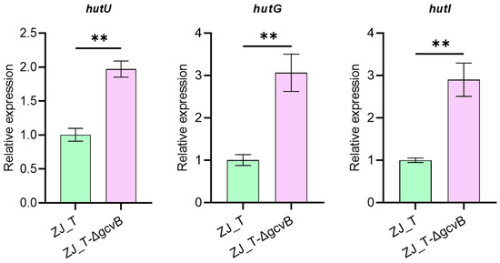 Relative expression of genes involved in the histidine metabolism pathway by qRT-PCR (Student ’s t-test, p value: **, <0.01). The levels of gcvB were normalized to the internal control 16S rRNA level. Error bars indicate standard deviations.
