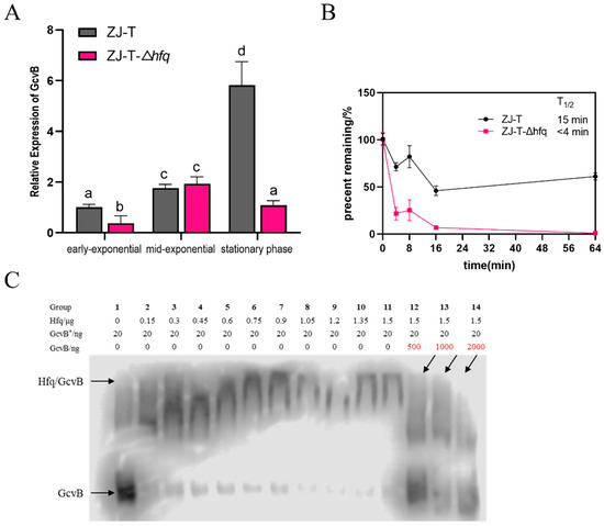 Effects of Hfq on GcvB. (A) Relative expression of GcvB at different periods of wildtype and hfq deletion strains. (B) Stability measurements of GcvB in hfq mutant strains. The half-life of GcvB is about 15 min in wild strain ZJ-T, but it is shortened to no more than 4 min in hfq deletion strain. (C) The Hfq protein binds specifically to GcvB. The picture shows the binding of GcvB to protein Hfq detected by RNA-EMSA. The Hfq protein was continuously added from 0 μg (group 1) to 1.5 μg (group 11). When the concentration of Hfq protein reached 1.05 μg (group 8), the binding of GcvB had reached saturation. After the addition of the non-biotinylated GcvB probe (groups 12, 13, 14), the biotinylated GcvB* was competitively eluted.