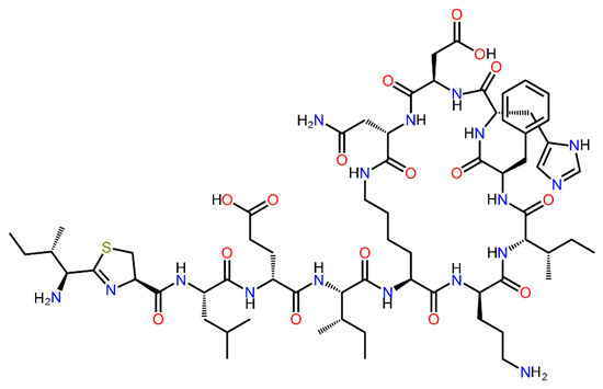 - Stone, K.J.; Strominger, J.L. Mechanism of action of bacitracin: Complexation with metal ion and C55-isoprenyl pyrophosphate. PNAS 1971, 68, 3223–3227. [Google Scholar] [CrossRef] [PubMed] [Green Version]