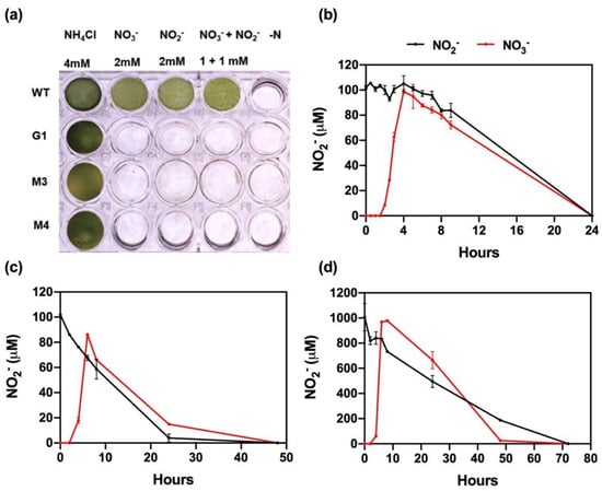 Chlamydomonas nii1 mutants (G1, M3, and M4) cannot reduce NO2− to ammonium (NH4+) and, therefore, do not grow in media containing either NO3− or NO2− as the sole nitrogen (N) source (Figure 1a). The G1 strain is a deletion mutant that lacks the entire cluster of the NO3− assimilation genes. This cluster, located in chromosome 9, contains the genes that encode NO3− and NO2− reductases (NIA1 and NII1, respectively) and the high-affinity NO3−/NO2− transport components (NRT2.1, NRT2.2, and NAR2) [40,41]. By genetic crosses, either the NIA1 and NRT2.1-NAR2 sets of genes or only NIA1 were transferred to the G1 strain, generating the M3 and M4 mutants, respectively (see [41] for more details). As previously mentioned, Chlamydomonas cells can reduce NO2− to NO [37] and NO to N2O [26,27]; therefore, we used these mutants as model organisms to study this process in microalgae. First, we studied NO2− evolution in the M3 strain. NH4+-grown cells were washed and transferred to fresh media containing 0.1 and 1 mM NO3− or NO2−, and NO2− concentration in the medium was determined at different time points (Figure 1b–d). Cells exposed to 0.1 mM NO3− showed a stoichiometric excretion of NO2− after 4 h (Figure 1b), as previously reported [41]. Subsequently, extracellular NO2− concentration slowly decreased, being completely exhausted from the medium after 24 h. Similar depletion rates and kinetics were observed when 0.1 mM NO2− was added instead, but a lag of 4–6 h was observed before the concentration started to decrease.