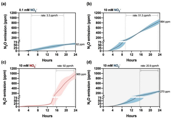 Kinetics of N2O emission in the M3 strain in the presence of NO3− and NO2−. NH4+-grown cells were washed and transferred to NO2−-containing media in sealed bottles at 0.1 mM (a) and 10 mM (b) in the light. Cells were also incubated in the presence of 10 mM NO3− under illumination (c) and 10 mM NO2− in the dark (d). Each data line represents an average of three biological replicates, and the colored area corresponds to ±SD.