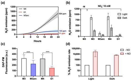 N2O emission by the nii1 mutants mainly depends on the functionality of the NR–ARC complex to reduce NO2− to NO. (a) N2O emissions by M3, G1, and M3arc strains in media containing 10 mM NO2− in the light. (b) Effect of light and dark on total N2O emission in the nii1 mutants in the presence of 10 mM NO2− after 24 h. (c) DAF-FM fluorescence in the nii1 mutants after 24 h incubation in 10 mM NO2− in the light. (d) N2O emission rates after adding 40 µM DEA-NONOate to G1 cultures in light and dark conditions. The initial rates (100%) correspond to 0.66 ppm/h (light) and 4.42 ppm/h (dark). Each data line in (a) represents an average of three biological replicates, and the colored area corresponds to ±SD. Error bars represent ±SD, n ≥ 3. Student’s t test was performed. **** p ≤ 0.0001.