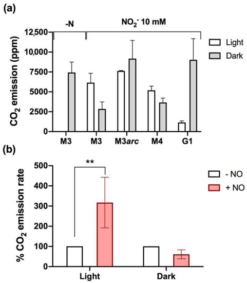 The low N2O production detected in these strains seems to point out that NO is not highly accumulated. Consequently, both strains exhibited high CO2 emissions in the dark and low CO2 levels in light (Figure 5c,d, and Supplementary Table S1), suggesting that 10 mM NO2− is not enough to alter CO2 evolution under our experimental conditions.