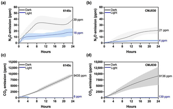 N2O and CO2 emissions in the wild-type strain 6145c and the nit1nit2 mutant CMJ030. NH4+-grown cells were washed and transferred to 10 mM NO2−-containing media in sealed bottles in the light (blue line) or the dark (black line). N2O emissions (a,b) and CO2 (c,d) were quantified during 24 h. Each data line represents an average of three biological replicates, and the colored area corresponds to ±SD.