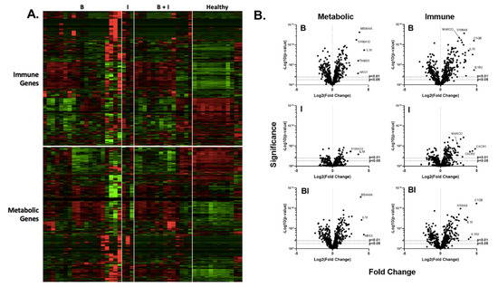 Analysis of the PBMC mRNA expression (Figure 2 and Figure 3, and Supplemental Table S1), revealed that B, I, and BI injuries promote significant changes in immune gene mRNA expression. Figure 2 demonstrates a (1) relative expression as depicted by heat maps (Figure 2A) and a significant fold-change as depicted by volcano plots (Figure 2B). Compared to healthy controls, 582 genes (347 increased, 235 decreased; Log2 fold-change −2.90–4.63) were significantly affected by B injuries (p < 0.05), 259 genes (164 increased, 95 decreased; Log2 fold-change −1.92–4.77) were significantly affected by I injuries, and 525 genes (317 increased, 208 decreased; Log2 fold-change −2.41–4.97) were significantly affected by BI injuries. As summarized in Figure 3, there were 263 genes, which are commonly affected by B and I injuries (146 increased, 90 decreased), 463, which are commonly affected by B and BI injuries (282 increased, 181 decreased), 214, which are commonly affected by I and BI injuries (129 increased, 85 decreased), and 210 genes, which are commonly affected by B, I, and BI injuries (125 increased, 85 decreased). Gene lists for each comparison of each injury modality versus the corresponding healthy component are provided in Supplemental Data. In conclusion, transcriptome analysis of the systemic PBMC response did demonstrate significant injury modality-specific immune and metabolic gene expression changes compared to healthy individuals.