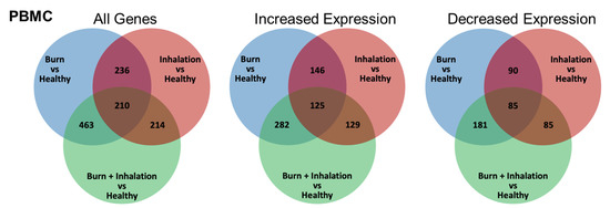 Burn injury, inhalation, and BI injuries induce unique and common gene expression profiles within PBMC. mRNA was isolated from PBMC, which was isolated from burn patients or healthy controls, and gene expression was evaluated using nanostring barcoding (nCounter Human Immune Profiling PanCancer CodeSet; 770 genes, and the Human Metabolic Gene CodeSet; 768 genes). The venn diagrams summarize the number of genes that are significantly (p < 0.05 using Welch’s t-test after data normalization to housekeeping and internalized the control genes with nSolver v4.0) impacted in a unique or common fashion to each injury type (when quantified versus healthy).