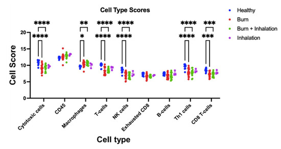 NanoString analysis was also used to profile the composition of immune cell types, utilizing pre-defined sets of genes to de-convolute relative frequencies of immune cell types. This method has been verified to correlate well with other methods using clinical samples, such as flow cytometry [18]. Based on PBMC gene expression, the presence of cytotoxic cells, CD45+ cells (pan-leukocyte marker), macrophages, T cells, natural-killer (NK), T helper 1 (Th1) T cells, and CD8 T cells were calculated (Figure 4). Regardless of burn injury or health, there were equivalent numbers of CD45+ cells, demonstrating that there are no gross changes in immune cell numbers after injury. PBMC samples from both B and BI injuries, compared to PBMC from healthy controls, presented a significant decrease in the abundance of cytotoxic cells, T cells, NK, Th1, and CD8 cells (p < 0.05), and a significant increase in the abundance of macrophages (p < 0.05). PBMC from inhalation injury alone did not present with any significant changes in abundance of the immune cell types quantified when compared to healthy controls. In conclusion, these data suggest that burn injury, either in isolation or combined with inhalation injury, is the main driver of changes in systemic immune cell populations.