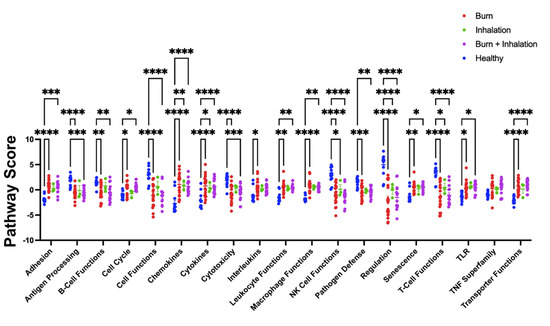 In order to identify the specific immune and metabolic pathways significantly affected by each injury modality, principal component analysis (PCA) was used to generate pathway scores (PS). PS are quantitative, and based on the individual gene expression levels, all the measured genes within a specific pathway were derived [19]. Figure 5 shows the PS for gene expression profiles from PBMC isolated from healthy individuals and all burn injury categories. Burn injury alone, I and BI injuries significantly invoked pathways involved in adhesion, chemokine, cytokines, and transporter functions, and significantly downregulated antigen processing, cell function, cytotoxicity, NK cell functions, and a regulatory pathway. Burn injury alone and combined BI, but not I injury alone, significantly downregulate pathways associated with cell-cycle, pathogen defense, and TLR signaling. In conclusion, these findings suggest that all three injury modalities studied independently induce acute systemic changes in a wide range of immune and metabolic pathways.