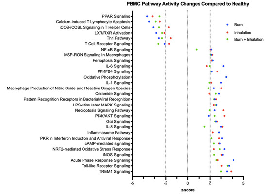 Burn, inhalation, and BI injuries induce significant alterations in peripheral immunometabolic canonical immune and metabolic signaling pathways compared to healthy controls. mRNA was isolated from PBMC, which was isolated from burn patients or healthy controls, and gene expression was evaluated using nanostring barcoding (nCounter Human Immune Profiling PanCancer CodeSet; 770 genes, and the Human Metabolic Gene CodeSet; 768 genes). Ingenuity pathway analysis (IPA) was employed to detect significant (p < 0.05) changes in canonical immune and metabolic pathways and quantify Z-scores.