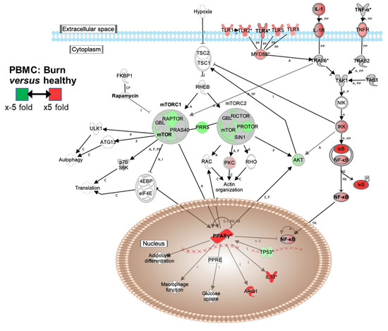 This work has identified PPARγ and IκB as two of the most highly induced members after injury. We have observed (1) an increase in TLR1, 2, 4, 5, IL-1R, and TNFR expression (as predicted by us and other studies, representing engagement of innate sensing molecules and cytokine receptors), (2) reduction in specific mTOR components RPTOR and PROTOR, (3) an increase in mTOR components LAMTOR2 and LAMTOR5, (4) an increase in PPARγ expression (which acts to downregulate mTOR activation), (5) an increase in expression of IkB (which inactivates NF-κB transcription factor), (6) an increase in anti-inflammatory IL-10 and ARG1 (also predicted in our earlier study) [16], and (7) increase in MRC1 expression (a key macrophage lectin sensor known to be regulated by the mTOR pathway and expressed by polarized anti-inflammatory “M2” macrophages). In addition, with regard to the mTOR axis, burn injury drives upregulation of PRAS40 and RPTOR. PRAS40 acts as an intersection of the Akt- and mTOR-mediated signaling pathways.